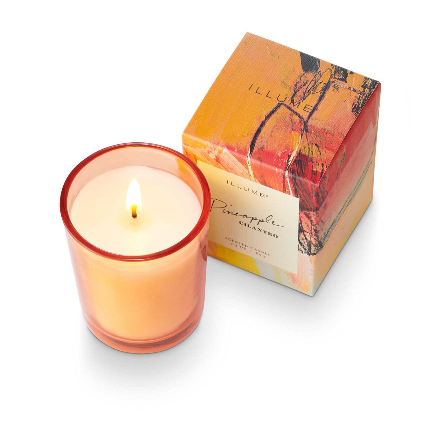 A limited edition tinted glass votive, tucked inside a gift-ready box featuring the abstract paintings of ILLUME founder,Lynette Reed.