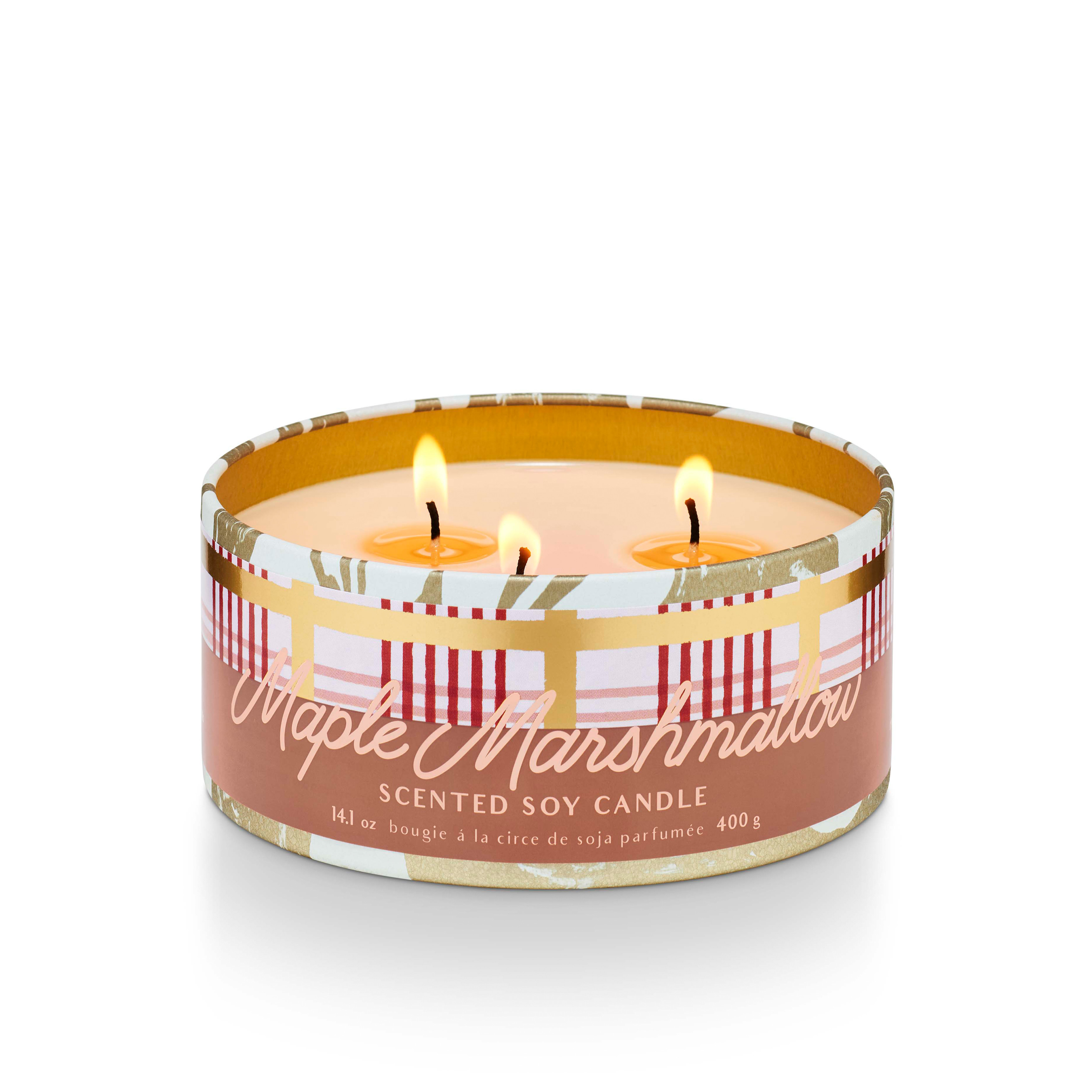 Fragrance Description: Notes of sugared marshmallow, warm woods, and maple. This scented 14.1 oz tin candle with lid makes a great gift. 30 hour burn time.